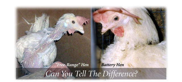 Some animal rights organizations have made tremendous strides in educating the public about what exactly occurs in battery hen operations. They have exposed the ugly truth such as tens of thousands of hens crowded into long poorly ventilated completely dark sheds, fully automated feeding and egg collecting systems, filth, death and suffering. The recognition of how horrible the short lives of “battery hens” are has led many people to stop contributing to the atrocity by simply not buying those eggs. Unfortunately, many other people have looked to so called "Cage Free/Free Range" eggs as an acceptable and humane alternative.