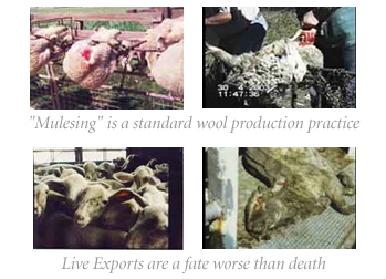 I am one of over 100 million sheep raised for wool. I am on a 14-tiered ship from Australia, headed for the Middle East where I will be ritually slaughtered while fully conscious. During our 3-4 month voyage, many of us will die from heat |